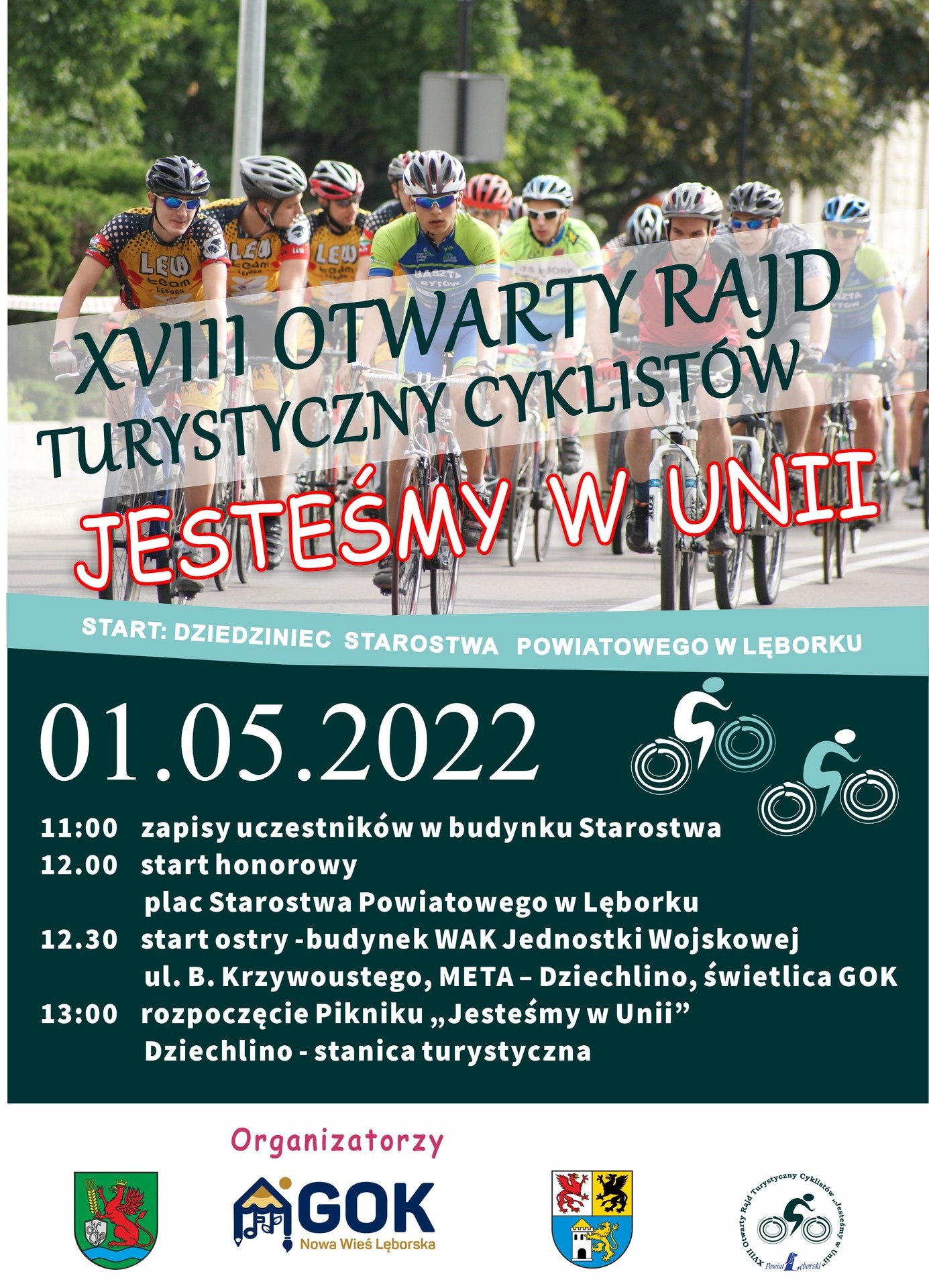 Honorowy start nastąpi w samo południe na placu Starostwa Powiatowego w Lęborku. Start ostry – również tradycyjnie sprzed budynku WAK jednostki wojskowej w Lęborku, przy ul. Krzywoustego. Meta – w Dziechlinie, przy wiejskiej świetlicy. Na mecie na uczestników czekać będą pamiątkowe dyplomy, puchary i drobne upominki. A później zacznie się Piknik „Jesteśmy w Unii”. Tym razem, na trasie rajdu, oprócz służby porządkowej imprezy, pojawi się profesjonalna ochrona, która dopilnuje bezpieczeństwa uczestników. Prosimy o stosowanie się do komunikatów i zaleceń, bo to wszystko dla wspólnego bezpieczeństwa, byśmy wszyscy cało dojechali do mety. Karta zgłoszenia i regulamin w załącznikach pod tekstem. Można wydrukować i z wypełnioną kartą pojawić się 1 maja na starcie przed starostwem. Tutaj również będzie można otrzymać pustą kartę do wypełnienia dla tych, którzy nie mają dostępu do drukarki. Serdecznie zapraszamy.