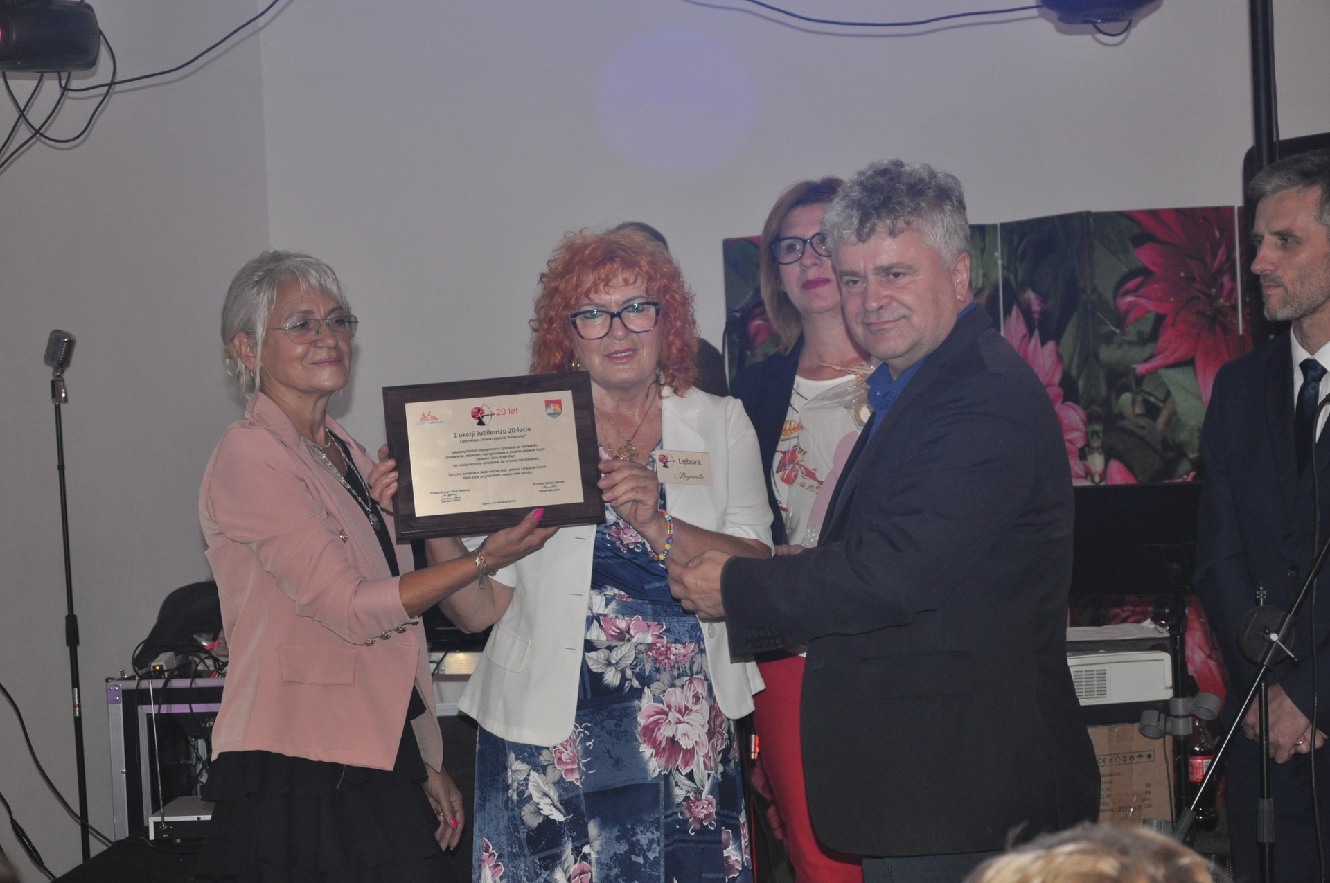 Burmistrz Lęborka Witold Namyślak wręczając jubileuszowy grawerton na ręce prezes stowarzyszenia Bogumiły Zielińskiej złożył podziękowanie i gratulacje za wytrwałość, poświęcenie, aktywność i zaangażowanie w niesieniu wsparcia innym kobietom, które nie muszą samotnie odnajdywać się w nowej, trudnej dla nich rzeczywistości.