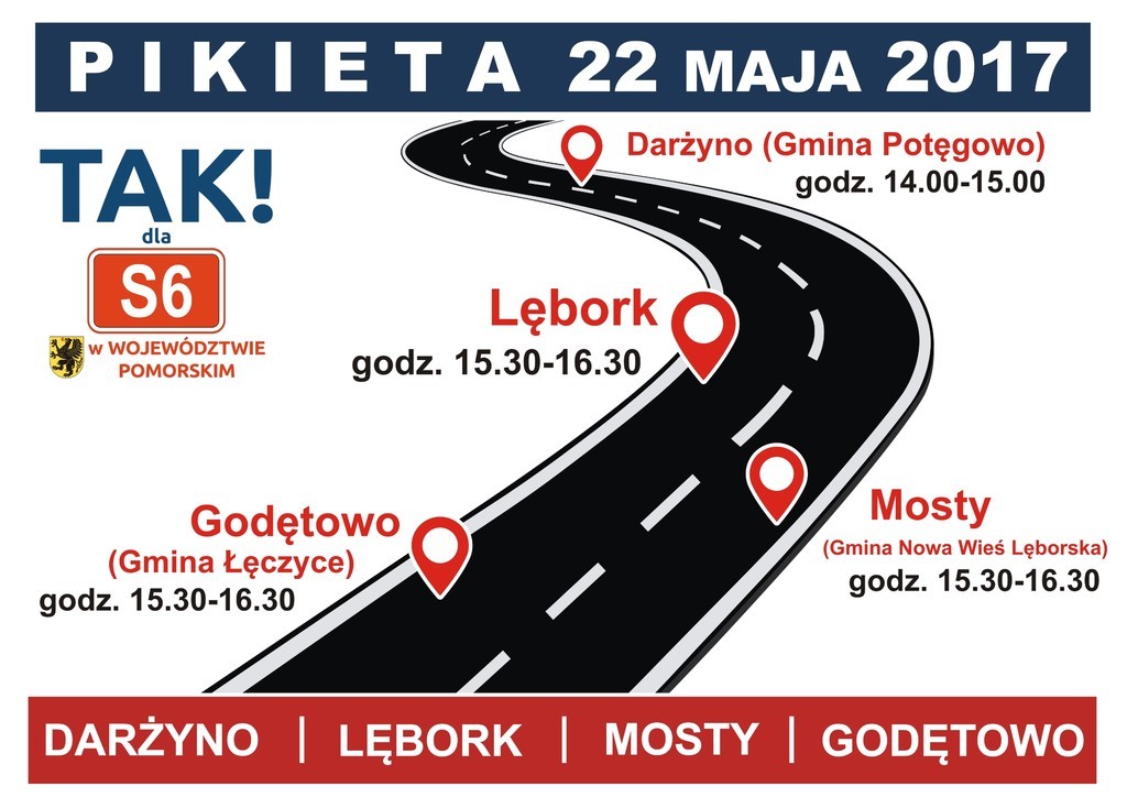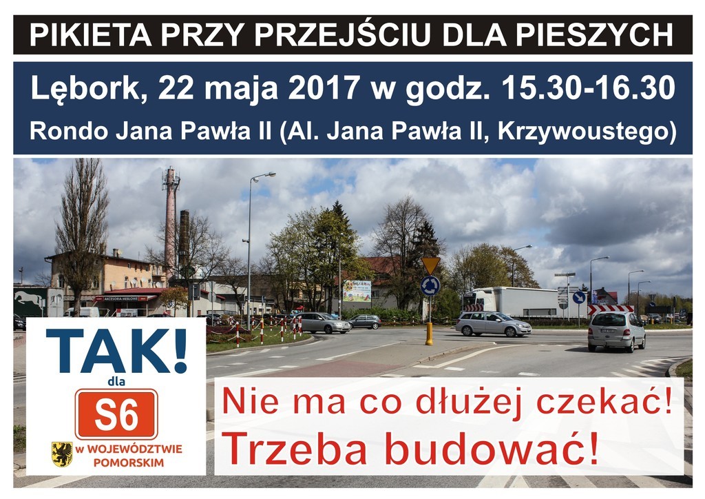 22 maja (poniedziałek) w Lęborku blokowana zostanie krajowa szóstka. Protest mieszkańców Lęborka przy rondzie Jana Pawła II prowadzony będzie w godz. 15.30-16.30. Podobne protesty w tym samym czasie odbywać się będą w Godętowie (gmina Łęczyce), Mostach (gmina Nowa Wieś Lęborska) oraz w Darżynie (gmina Potęgowo).