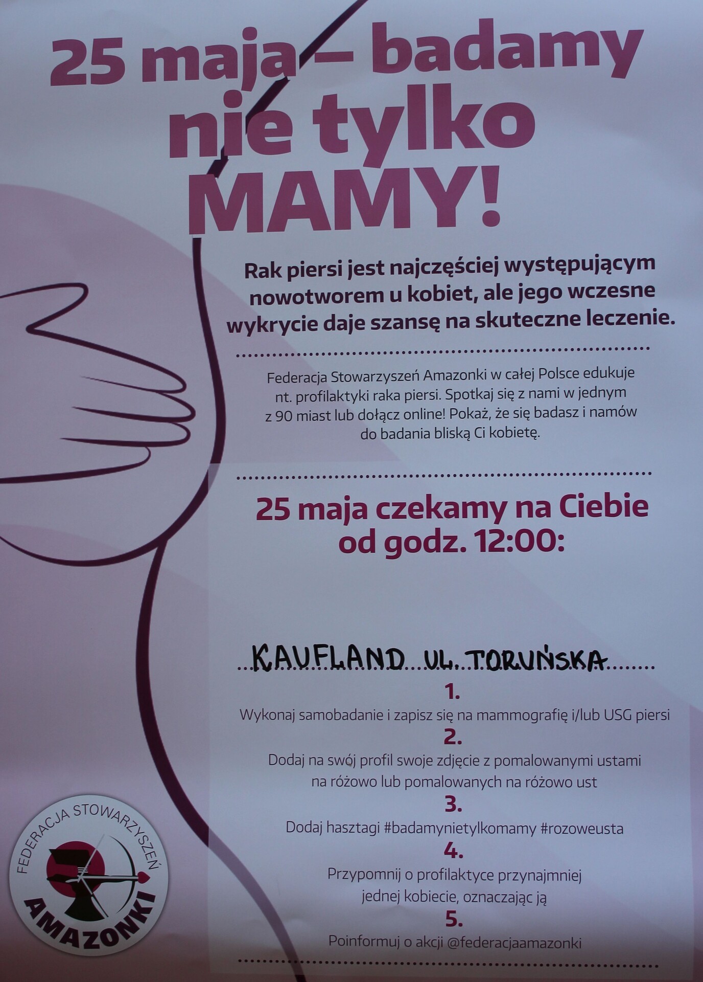 Co podarować mamie z okazji Dnia Matki? Najlepszym prezentem jest zdrowie. Federacja Stowarzyszeń Amazonki przekonuje, że najlepszym prezentem dla mamy jest troska o jej zdrowie. Dlatego już po raz drugi organizuje ogólnopolską akcję „Badamy nie tylko mamy”. 25 maja w ponad 90 miastach Polski Amazonki będą edukować w zakresie profilaktyki raka piersi. W Lęborku akcja wystartuje w sobotę 25 maja o godzinie 12:00 pod „Kauflandem” przy ul. Toruńskiej.
