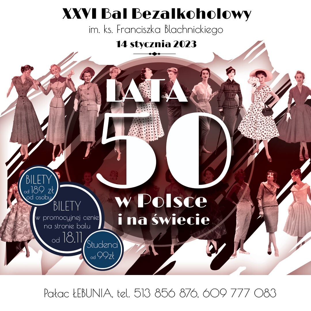Ale kobiet i mężczyzn tamtych lat, wyjątkowych, zmianujących rzeczywistość było więcej. Dlatego 26 Bal Bezalkoholowy w Lęborku poświęcimy właśnie im, oraz dekadzie, w której żyli. Wtedy też swoja działalność rozpoczął patron wydarzenia. Ks. Franciszek BLACHNICKI.