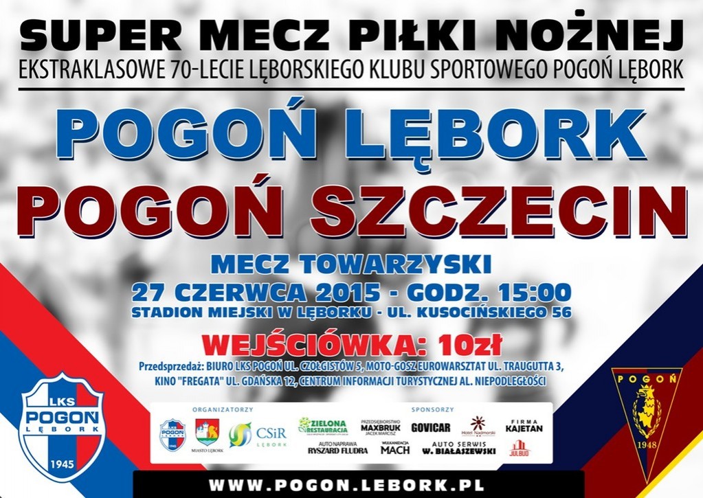 W ramach Jubileuszu 70-lecia Pogoni Lębork 27 czerwca 2015 o godz. 15 odbędzie się super mecz. Pogoń Lębork podejmie w meczu towarzyskim klub T-Mobile ekstraklasy Pogoń Szczecin. „Portowcy” do Lęborka przyjadą w składzie w jakim 2 dni później rozpoczną obóz przygotowawczy we Wronkach. Oznacza to, że zobaczymy wielu utytułowanych zawodników, m.in. Rafała Murawskiego, Łukasza Zwolińskiego czy Patryka Małeckiego.