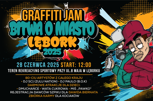Już w sobotę, 29 czerwca, Lębork zamieni się w kolorową stolicę sztuki ulicznej! Na terenie kompleksu rekreacyjno - sportowego przy ul. 8 Maja odbędzie się tegoroczna edycja wyjątkowego wydarzenia – pikniku graffiti „Bitwa o Miasto”. Start imprezy o godz. 12:00, wstęp wolny.