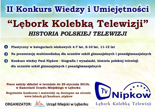 Rusza II edycja Konkursu Wiedzy i Umiejętności „Lębork Kolebką Telewizji". W 2010r. przypada 150-rocznica urodzin znanego lęborczanina i wynalazcy Paula Nipkowa. W I edycji konkursu na konkurs plastyczny wpłynęło 529 prac, na prezentację multimedialną - 34 prac, na projekt strony internetowej - 8. Finał konkursu 5 marca 2010r.