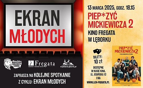 Lęborskie Centrum Kultury "Fregata" i Młodzieżowa Rada Miasta Lęborka zapraszają na marcowe spotkanie z cyklu "Ekran Młodych". W czwartek, 13 marca 2025 roku, odbędzie się seans filmu "Piep*zyć Mickiewicza 2".