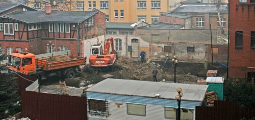 Trwa rozbiórka dwóch budynków gospodarczych (dwóch garaży i budynku obsługi technicznej) lęborskiego ratusza.