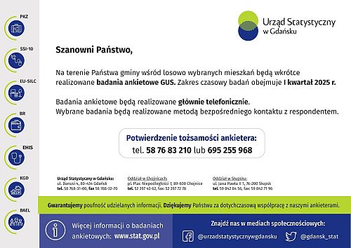 Na terenie Państwa gminy wśród losowo wybranych mieszkańców będą wkrótce realizowane badania ankietowe GUS. Zakres czasowy badań obejmuje I kwartał 2025 r.
