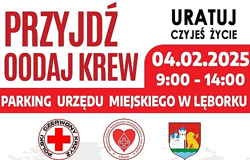 Regionalne Centrum Krwiodawstwa i Krwiolecznictwa im. Jana Pawła II w Słupsku, Polski Czerwony Krzyż Oddział w Lęborku, Urząd Miejski w Lęborku i Powiatowy Klub Honorowych Dawców Krwi PCK w Lęborku są organizatorami akcji oddawania krwi. Wydarzenie odbędzie się we wtorek 4 lutego, w godzinach 9:00 – 14:00 na parkingu przy ratuszu, gdzie stanie krwiobus - mobilny punkt poboru krwi.