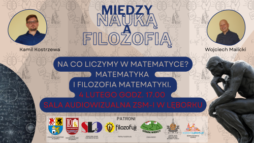Zapraszamy na trzecie spotkanie w ramach cyklu "Między nauką a filozofią", które odbędzie się 4 lutego o godz. 17.00 w auli Zespołu Szkół Mechaniczno-Informatycznych w Lęborku przy ulicy Marcinkowskiego. Tematem spotkania będzie matematyka i filozofia matematyki.