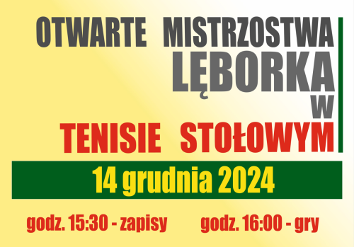 Centrum Sportu i Rekreacji w Lęborku zaprasza do udziału w Otwartym Turnieju Tenisa Stołowego, który odbędzie się 14 grudnia 2024 roku w Miejskiej Hali Sportowej (ul. P. Skargi 52, Lębork). Zawody rozpoczną się o godzinie 15:30 i potrwają do 20:00.