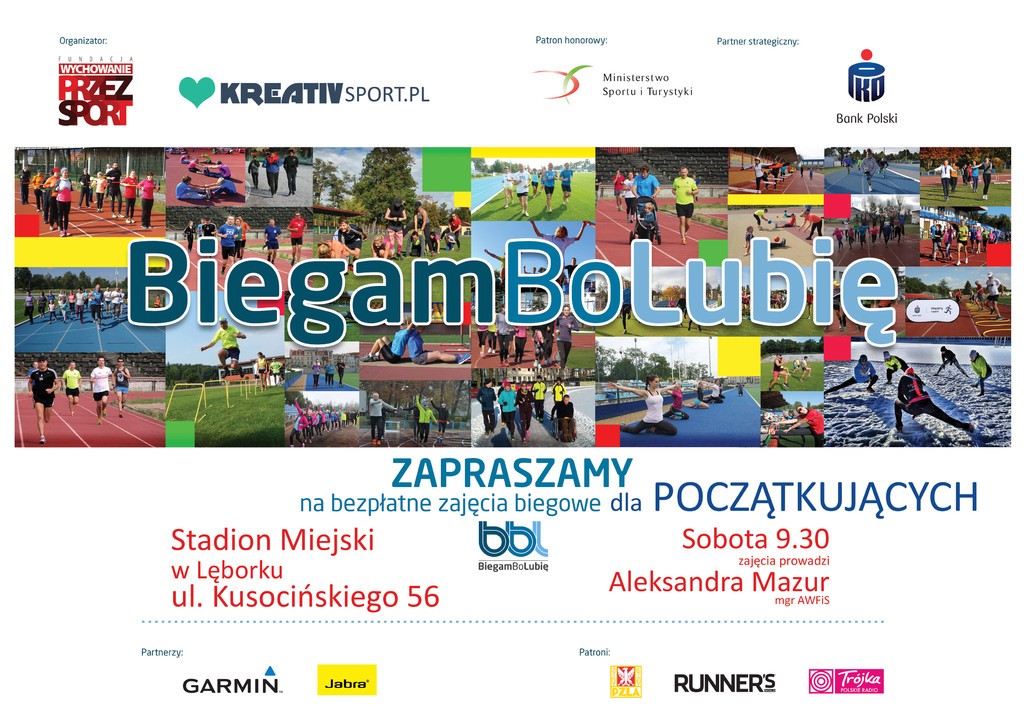 Fundacja Wychowanie Przez Sport wraz z partnerami strategicznymi i medialnymi oraz organizator akcji w Lęborku KreativSport zapraszają na cykl bezpłatnych treningów biegowych na Stadionie Miejskim w Lęborku. Zajęcia odbywają się w każdą sobotę o godzinie 9.30 przy ul. Kusocińskiego 56.