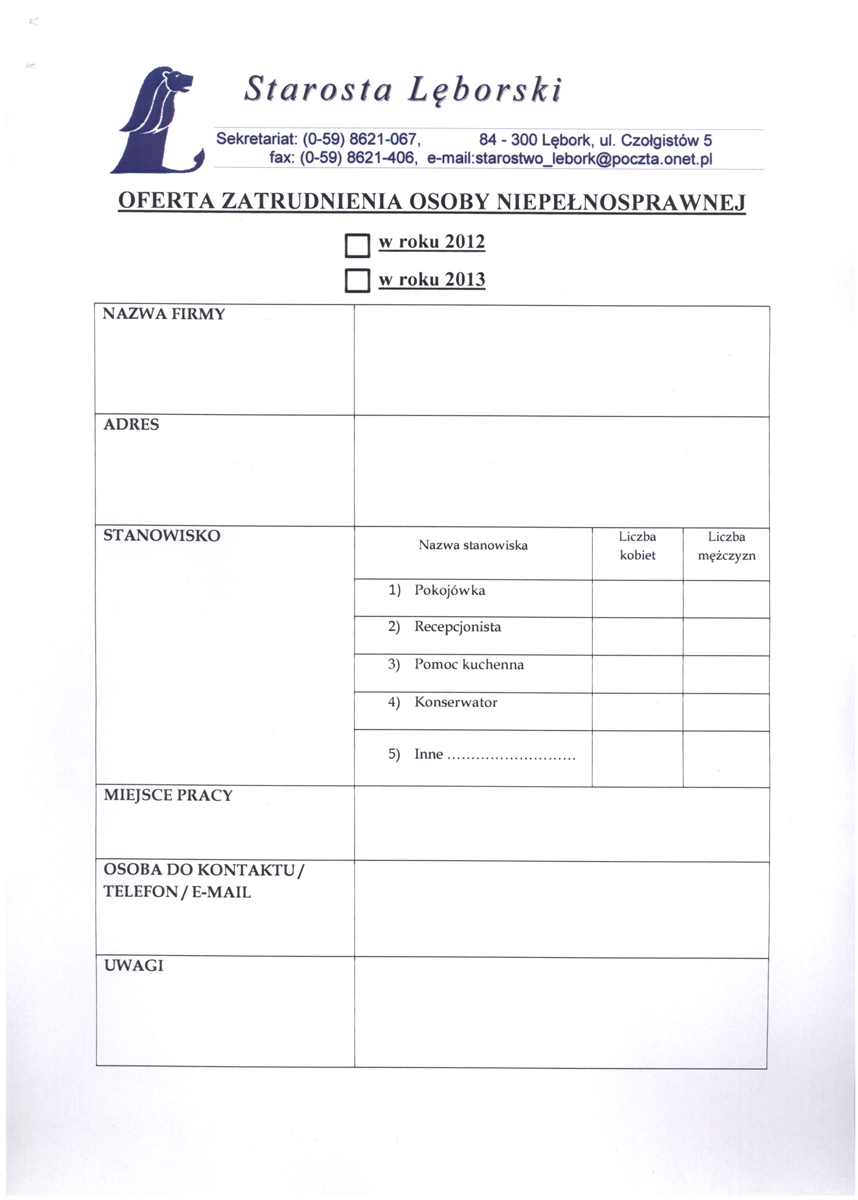Poniżej oferta zatrudnienia (druk), którą po wypełnieniu należy odesłać do Starostwa Powiatowego w Lęborku, ul. Czołgistów 5, na e-mail: rpp-lebork [AT] wp [DOT] pl lub fax 59 8632 851.