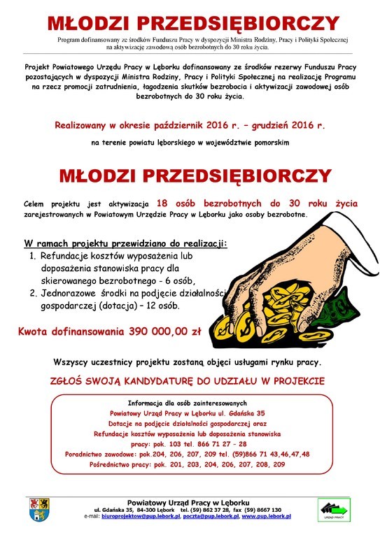 Powiatowy Urząd Pracy w Lęborku informuje, iż pozyskał dodatkowe środki Funduszu Pracy pozostające w dyspozycji Ministra Rodziny, Pracy i Polityki Społecznej na realizację Programu na rzecz promocji zatrudnienia, łagodzenia skutków bezrobocia i aktywizacji zawodowej bezrobotnych do 30 roku życia - projekt pn. „Młodzi przedsiębiorczy”.