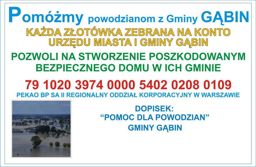 W ulotce podany jest nr konta utworzonego w Urzędzie Miasta i Gminy Gąbin, na które można wpłacać datki przeznaczone na pomoc dla powodzian.