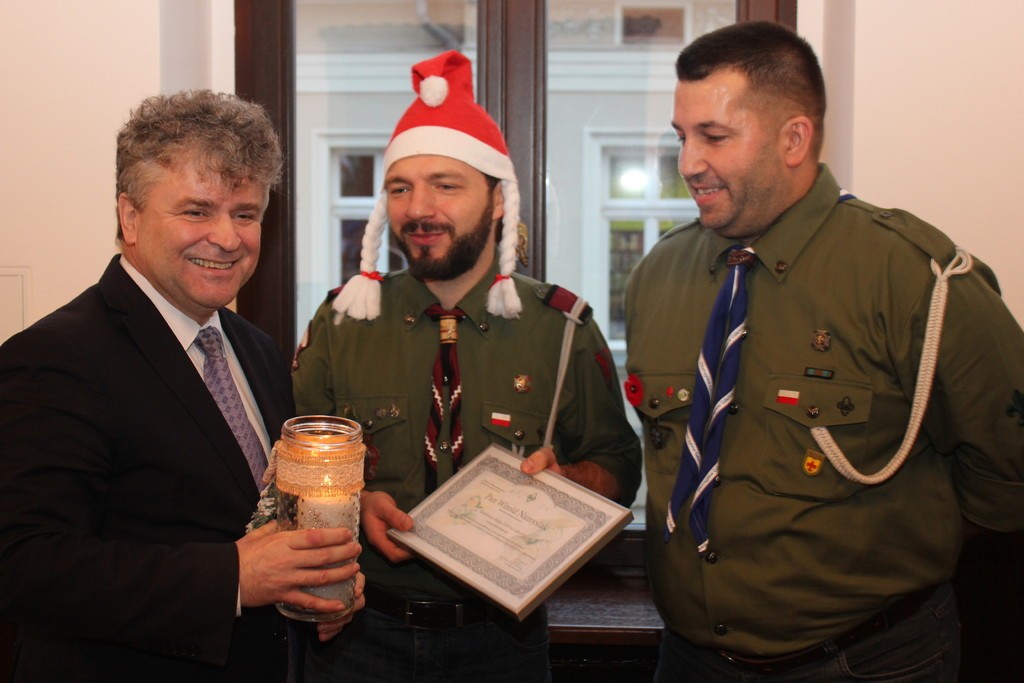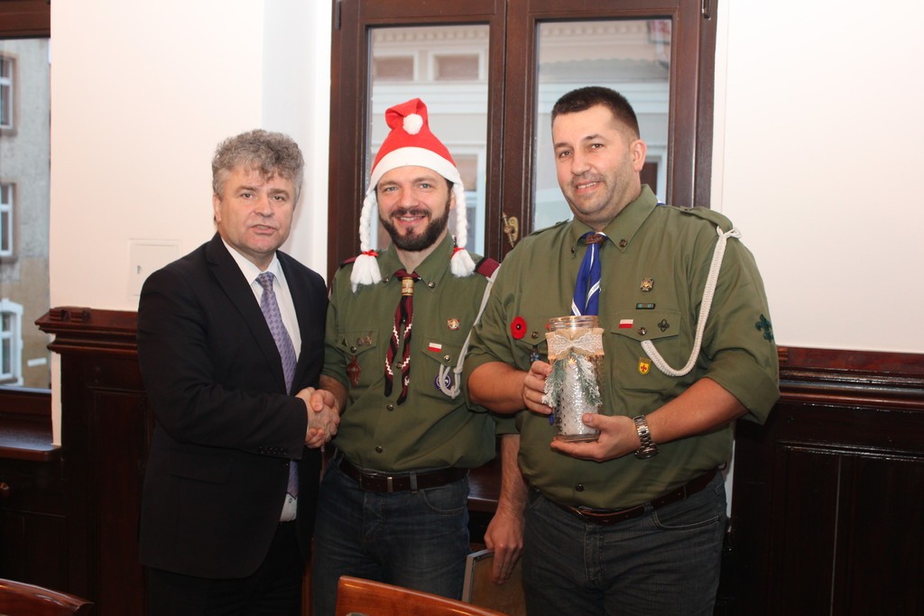 Światełko wraz z życzeniami świątecznymi przyjął od komendanta lęborskiego Hufca ZHP, Michała Kozłowskiego oraz zastępcy komendanta, Konrada Chmiela Burmistrz Lęborka - Witold Namyślak.