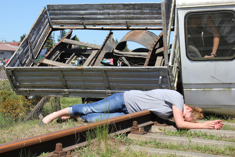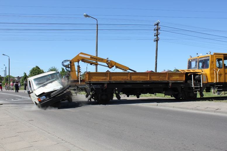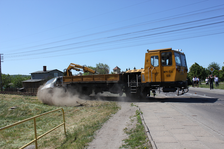 Drezyna jadąca z niewielką prędkością ok. 30 km/h uderzyła w stojący na torach samochód. Można było zobaczyć jakie uszkodzenia samochodu powoduje takie uderzenie. Akcja obejmowała także skutki dla pasażerów znajdujących się w takim pojeździe oraz akcję ratunkową.
