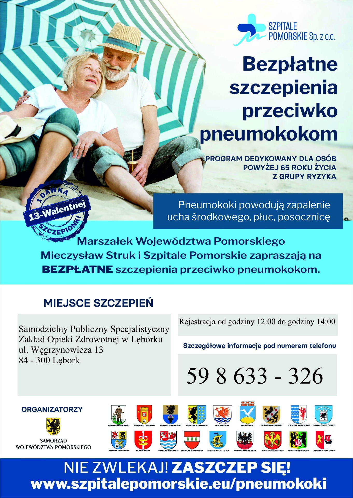 W szpitalu w Lęborku prowadzone będą bezpłatne szczepienia dla osób 65+ z grup ryzyka. Szczegółowe informacje można uzyskać pod numerem telefonu 59 863-33-26 w godz. 12-14. Akcja szczepień to wspólna akcja samorządu Powiatu Lęborskiego i Województwa Pomorskiego. Jej celem jest wsparcie seniorów, zwłaszcza z tzw. grup ryzyka, czyli obciążonych schorzeniami przewlekłymi. Szczepieniami objętych zostanie 65 osób.