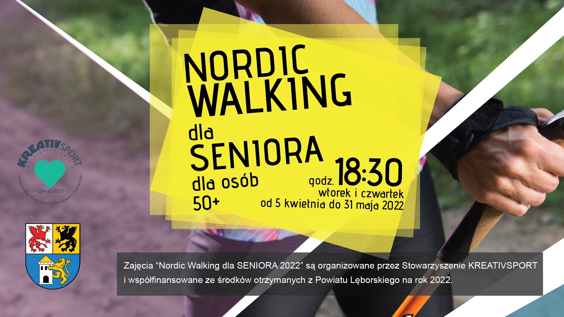 Stowarzyszenie Kreativ Sport zaprasza na bezpłatne zajęcia Nordic Walking, w każdy wtorek i czwartek o godz. 18.30 od 5 kwietnia do 31 maja 2022 r. Zbiórka przy Stadionie Miejskim w Lęborku, parking Pływalni Miejskiej "Rafa".