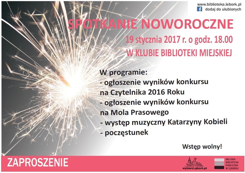 Miejska Biblioteka Publiczna w Lęborku zaprasza 19 stycznia 2017 r. o godz. 18 do klubu biblioteki na Spotkanie Noworoczne. W programie ogłoszenie wyników konkursu na Czytelnika 2016 Roku, ogłoszenie wyników konkursu na Mola Prasowego, a także występ muzyczny Katarzyny Kobieli i poczęstunek. Wstęp wolny.