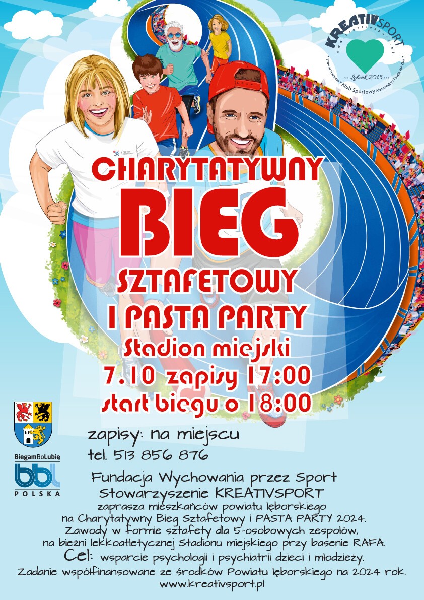 Bieg Sztafetowy i PASTA PARTY to lokalna forma zawodów biegowych organizowanych przez Fundację Wychowania przez Sport w 12 miastach Polski pod nazwą PKO Bieg Charytatywny. W Lęborku odbędzie się on 7 października już po raz 5. Lokalnym organizatorem jest Stowarzyszenie KREATIVSPORT, głównym sponsorem Bank Polski PKO. W tym roku Stowarzyszenie KREATIVSPORT otrzymało także wsparcie finansowe z Powiatu Lęborskiego.