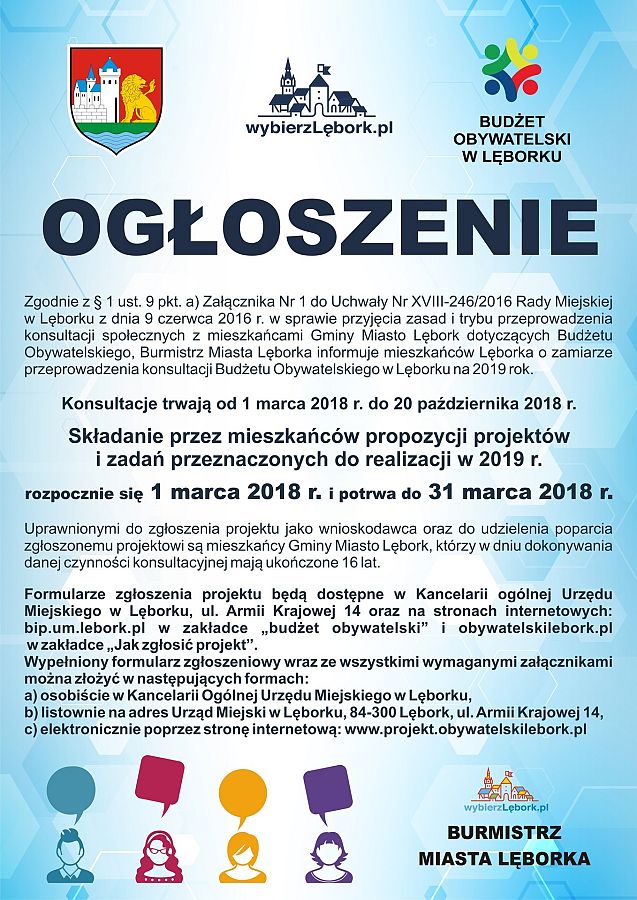 Uprawnionymi do zgłaszania projektu jako wnioskodawca oraz do udzielenia poparcia zgłoszonemu projektowi są mieszkańcy Gminy Miasto Lębork, którzy w dniu dokonywania danej czynności konsultacyjnej mają ukończone 16 lat. Tegoroczne konsultacje potrwają od 1 marca 2018 r. do 20 października 2018 r.