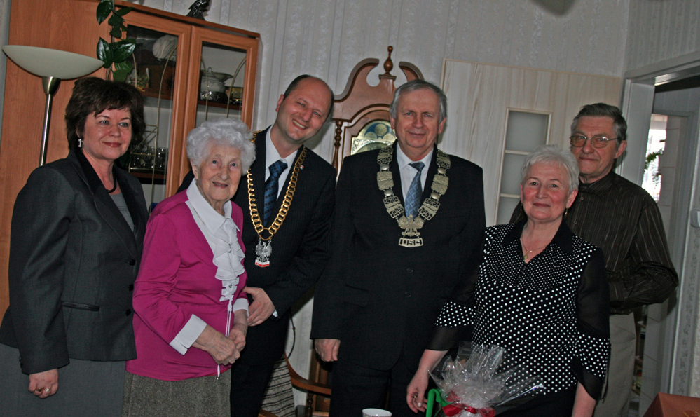 100 lat skończyła 20 kwietnia 2010r. Gertruda Potrykus, mieszkanka Lęborka. "Okrągły" jubileusz był okazją do rodzinnego świętowania, a także do wizyty u Jubilatki Burmistrza Włodzimierza Klaty, który wraz z kierownikiem USC Zygmuntem Lisieckim złożył pani Gertrudzie życzenia, wraz z kwiatami i upominkiem.