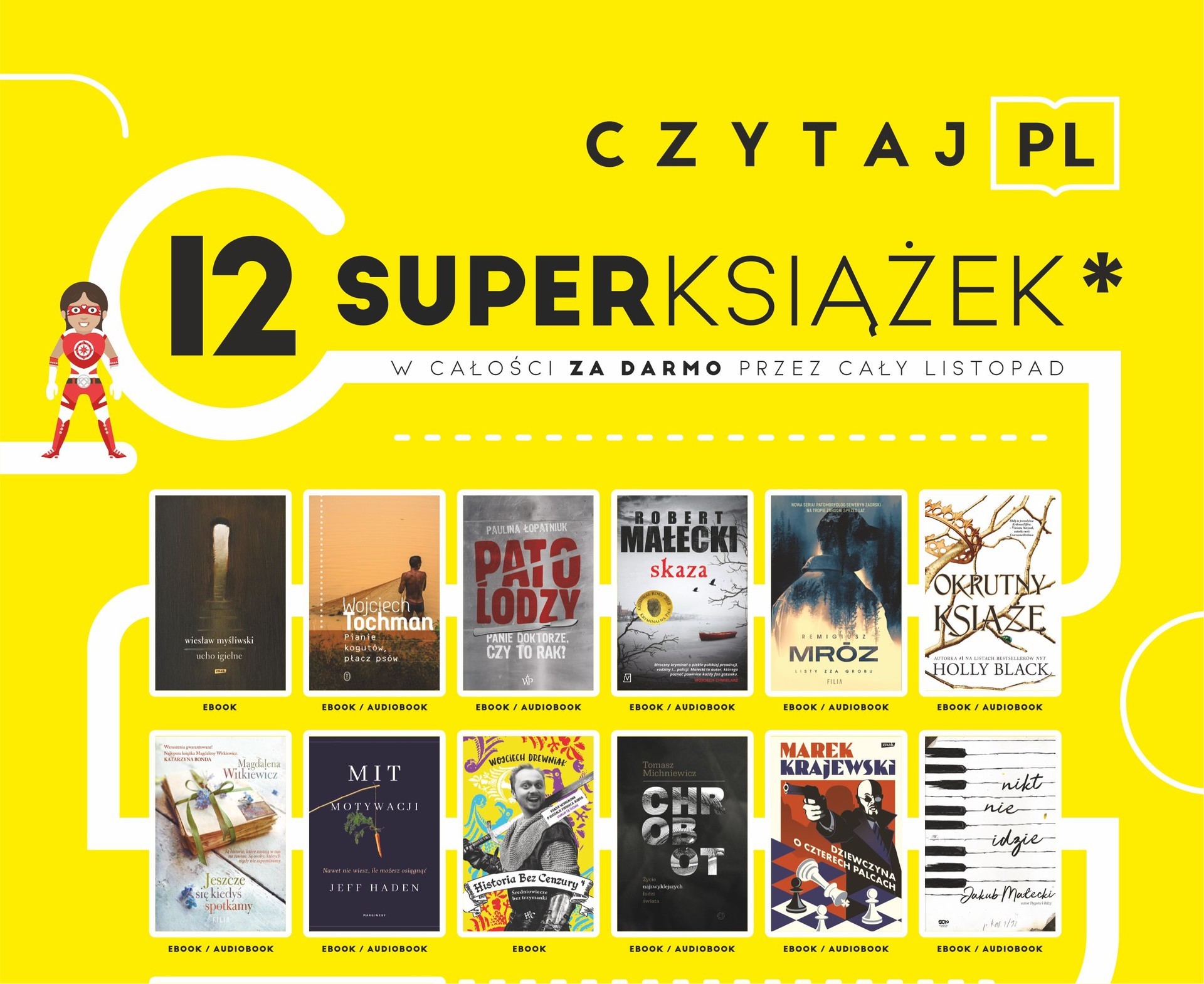 Do 30 listopada 2019 r. na stronie CZYTAJ PL Instytut Książki oferuje bezpłatnie aż 12 superksiążek i 10 audiobooków. Do wyboru m. in. Mróz, Michniewicz, Witkiewicz, Krajewski; kryminały, reportaże, książki obyczajowe.