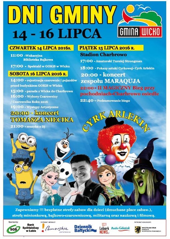 W dniach 14-16 lipca Gmina Wicko zaprasza na szereg wydarzeń w ramach Dni Gminy. W programie m.in. wybory Czarownicy/Czarownika Roku, pokazy sztuki cyrkowej, Amatorski Turniej Strongman, koncert Tomasza Niecika.