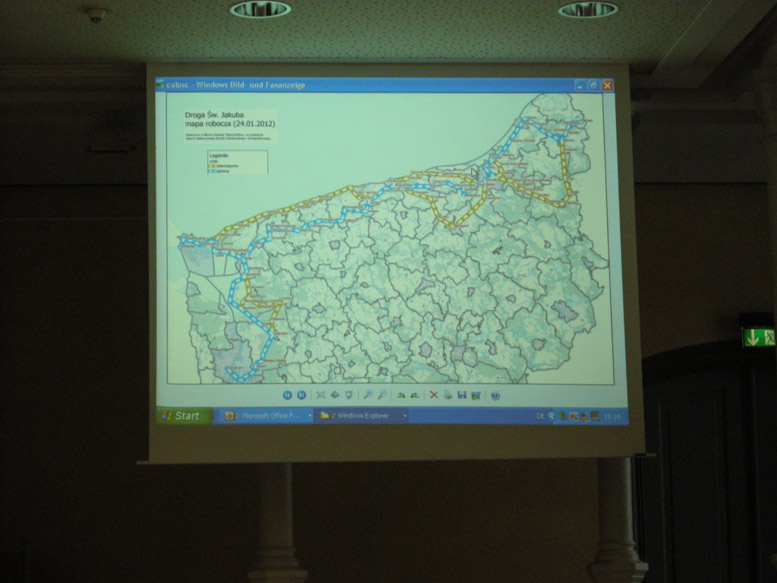 Omówiono przebieg proponowanej Pomorskiej Drogi św. Jakuba i jej powiązanie z Drogami w Europie. Turysta - pielgrzym ruszający z wybranego miejsca w Polsce, np.: Elbląga, Lęborka czy Szczecina będzie mógł - dzięki oznakowaniu, przewodnikom i mapkom internetowym (w tym z czytnikami GPS) dotrzeć bez większych problemów do celu - Santiago de Compostela.