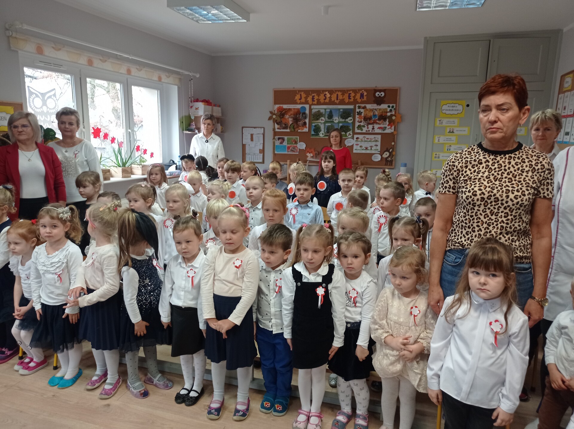 Narodowy Dzień Niepodległości wierszem, tańcem i piosenką uświetniła grupa starszaków pod kierunkiem pań A. Gapińskiej i A. Przybylskiej.