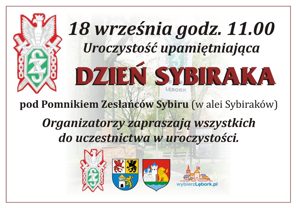 Tegoroczne obchody Dnia Sybiraka odbędą się w poniedziałek 18 września o godz.11.00 przy pomniku poświęconym Zesłańcom Sybiru w Alei Sybiraków, w parku M. Michalskiego.
