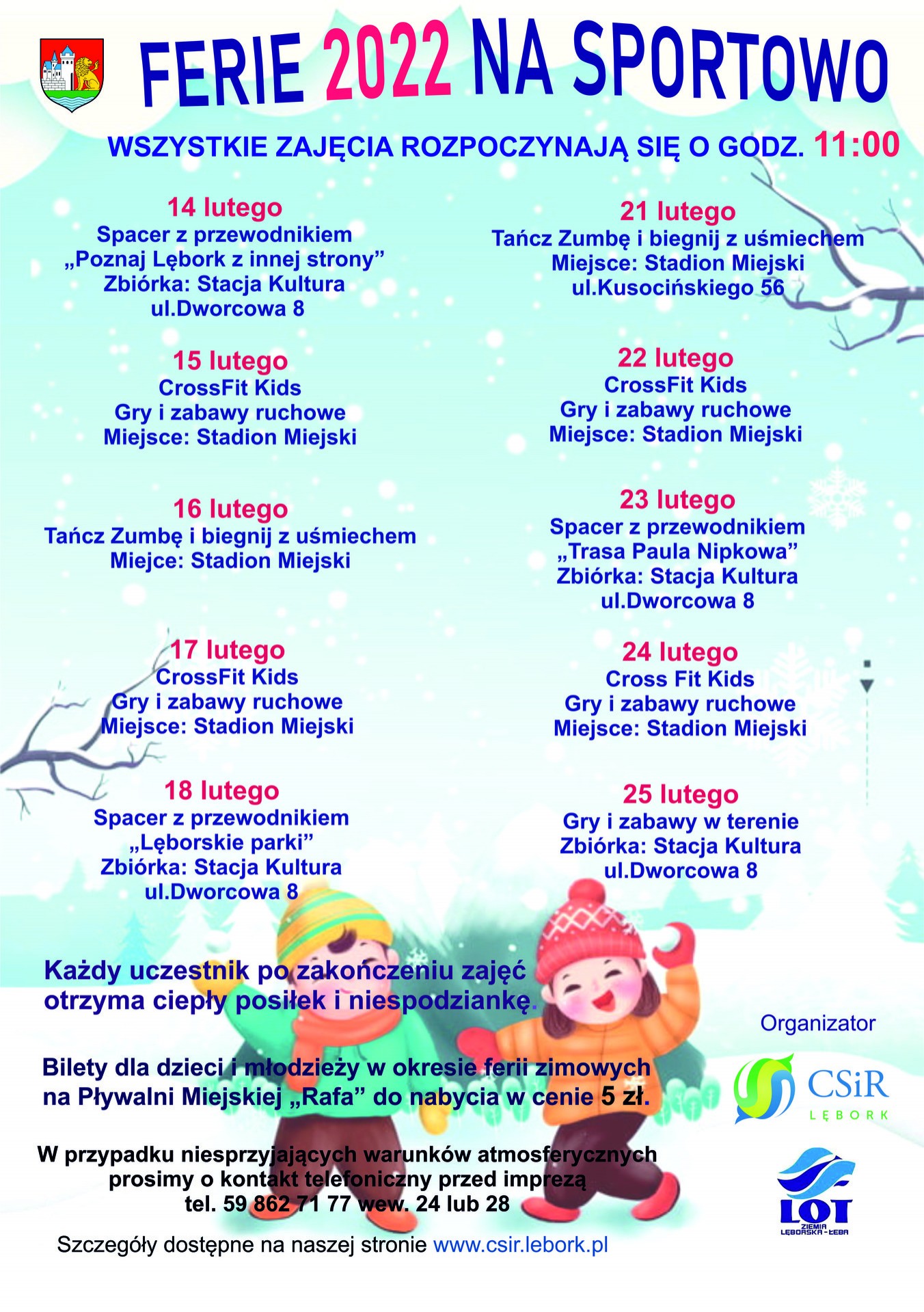 W związku ze znacznym wzrostem zachorowań na Covid-19 w powiecie lęborskim oraz dużą liczbą osób przebywających na kwarantannie i w izolacji, uprzejmie informujemy, że w tym roku „Ferie 2022 na sportowo” zostaną przeprowadzone w zupełnie innej formule. Wszystkie zajęcia sportowo-rekreacyjne dla dzieci i młodzieży w wieku "od lat 5 do 105" odbędą się na świeżym powietrzu i będą miały charakter zabaw.
