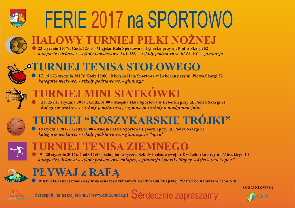 W okresie ferii zimowych Centrum Sportu i Rekreacji w Lęborku będzie organizatorem cyklu zawodów sportowych w ramach akcji „ Ferie 2017 na sportowo”.