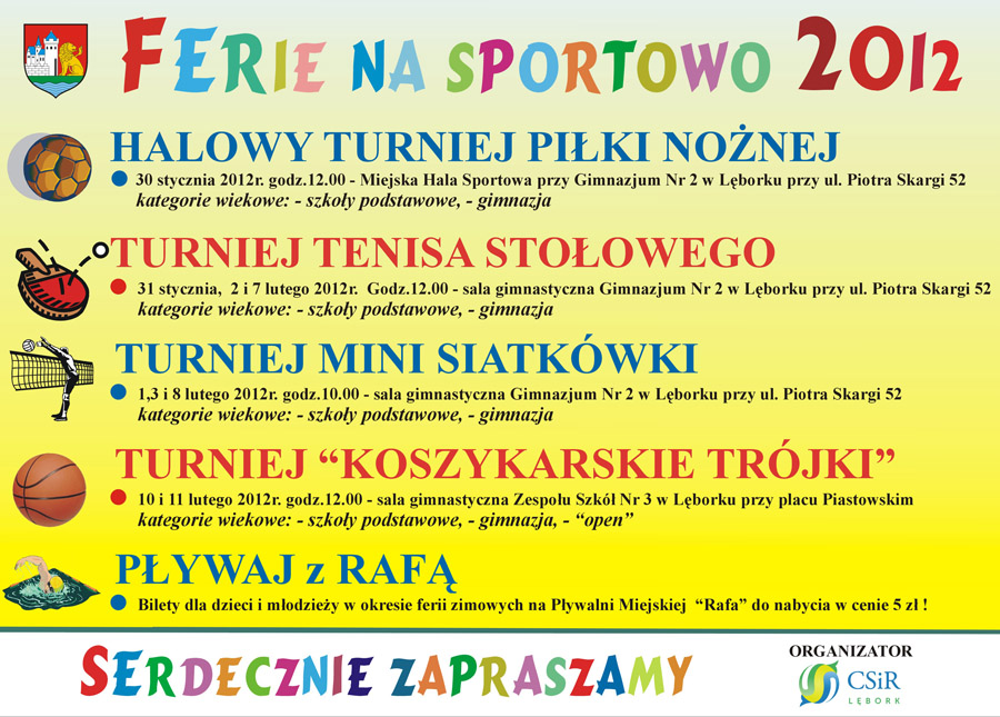 Halowy turniej piłki nożnej rozegranie zostanie w Miejskiej Hali Sportowej przy Gimnazjum Nr 2 w Lęborku przy ul. P. Skargi 52. Zapisy do turnieju przyjmowane będą 30 stycznia 2012r. /poniedziałek/ od godziny 1200 w miejscu rozgrywania zawodów (odpowiedzialny - Zbigniew Nastały).
