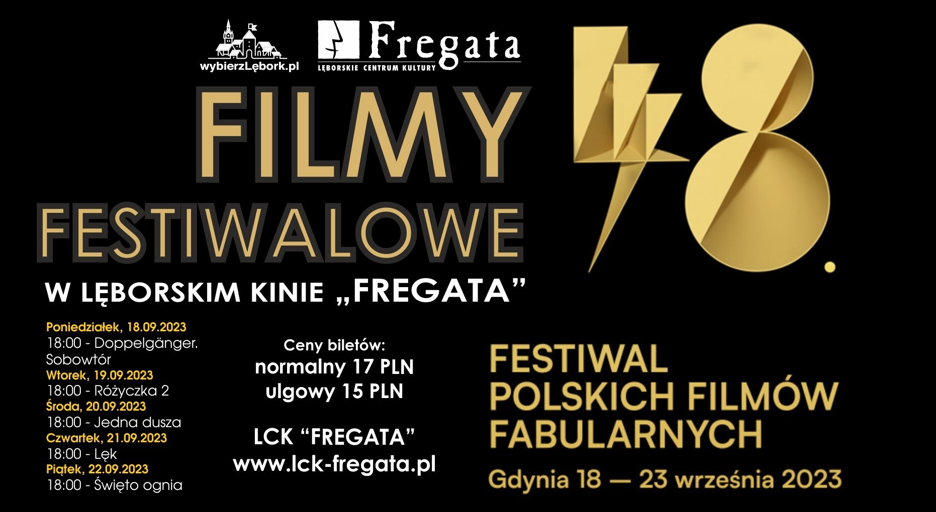 Seanse festiwalowe w Lęborku będą odbywały się w tym samym czasie, co w Gdyni, czyli od 18 do 22 września. Równolegle z pokazami festiwalowymi we „Fregacie” po raz kolejny będzie można skorzystać z bezpłatnego przeglądu filmów dla dzieci pod hasłem „Gdynia Dzieciom”.