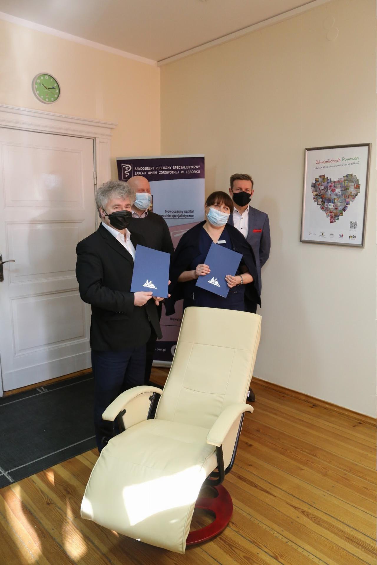 10 nowoczesnych foteli masujących „VIDA XL” zostało przekazanych przez miasto Lębork na Oddział Ginekologiczno-Położniczy oraz Oddział Neonatologiczny w lęborskim szpitalu. Fotele przeznaczone są dla matek karmiących, które po porodzie będą mogły korzystać z wygodnych foteli w trakcie karmienia piersią. Posiadając taki sprzęt szpital będzie mógł świadczyć usługi w jeszcze większym standardzie. W oficjalnym przekazaniu foteli wziął udział Witold Namyślak, Burmistrz Miasta Lęborka, Marian Kurzydło – Sekretarz Miasta oraz Marta Frankowska – Dyrektor Samodzielnego Publicznego Specjalistycznego Zakładu Opieki Zdrowotnej w Lęborku i Adam Hoffmann Dyrektor ds. finansowych SPS ZOZ.