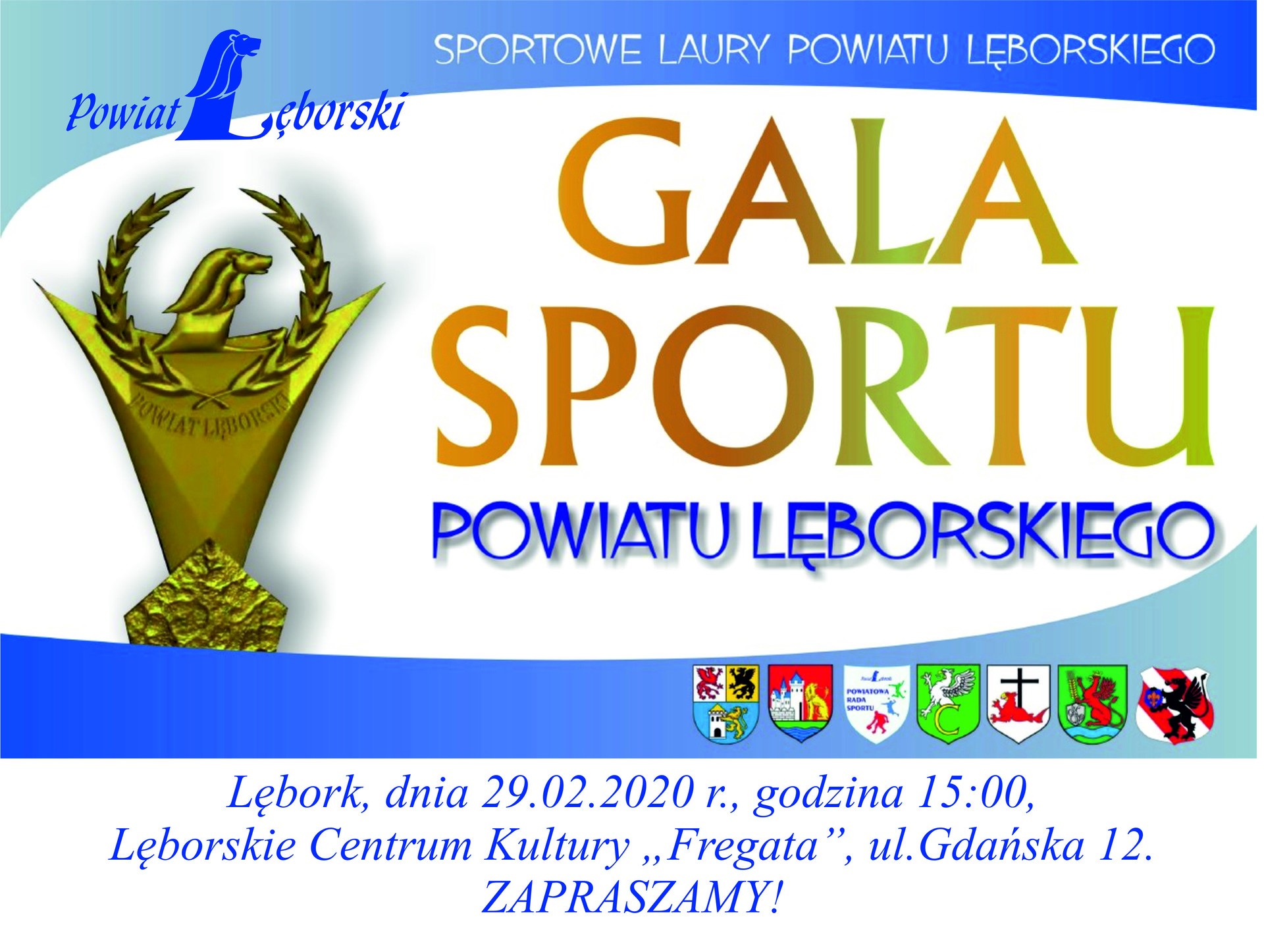29 lutego br. o godz. 15.00 w sali kinowej Lęborskiego Centrum Kultury "Fregata" odbędzie się uroczysta XIII Gala Sportu Powiatu Lęborskiego. Podczas Gali najlepsi sportowcy, trenerzy, drużyny i działacze powiatu lęborskiego otrzymają wyróżnienia i nagrody Starosty Lęborskiego oraz „Sportowe Laury Powiatu Lęborskiego 2019”.
