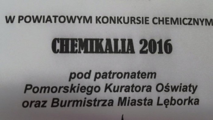 3 czerwca br. w Gimnazjum nr 2 w Lęborku w odbyła się kolejna edycja Powiatowego Konkursu Chemicznego "Chemikalia 2016". Konkurs miał za zadanie sprawdzić wiedzę chemiczną uczniów gimnazjów z powiatu lęborskiego. Patronat nad konkursem objął Pomorski Kurator Oświaty oraz Burmistrza Miasta Lęborka.