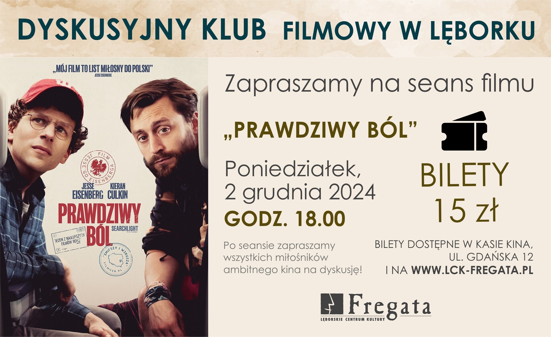 W poniedziałek, 2 grudnia 2024 roku, w lęborskim Kinie "Fregata" odbędzie się kolejny seans w ramach Dyskusyjnego Klubu Filmowego. O godzinie 18 zostanie wyświetlony film pod tytułem "Prawdziwy ból". Po seansie zapraszamy wszystkich miłośników kina ambitnego na dyskusję. Wstęp na seans kosztuje 15 złotych. Bilety można rezerwować i kupować za pośrednictwem strony www.lck-fregata.pl oraz w kasie kina.