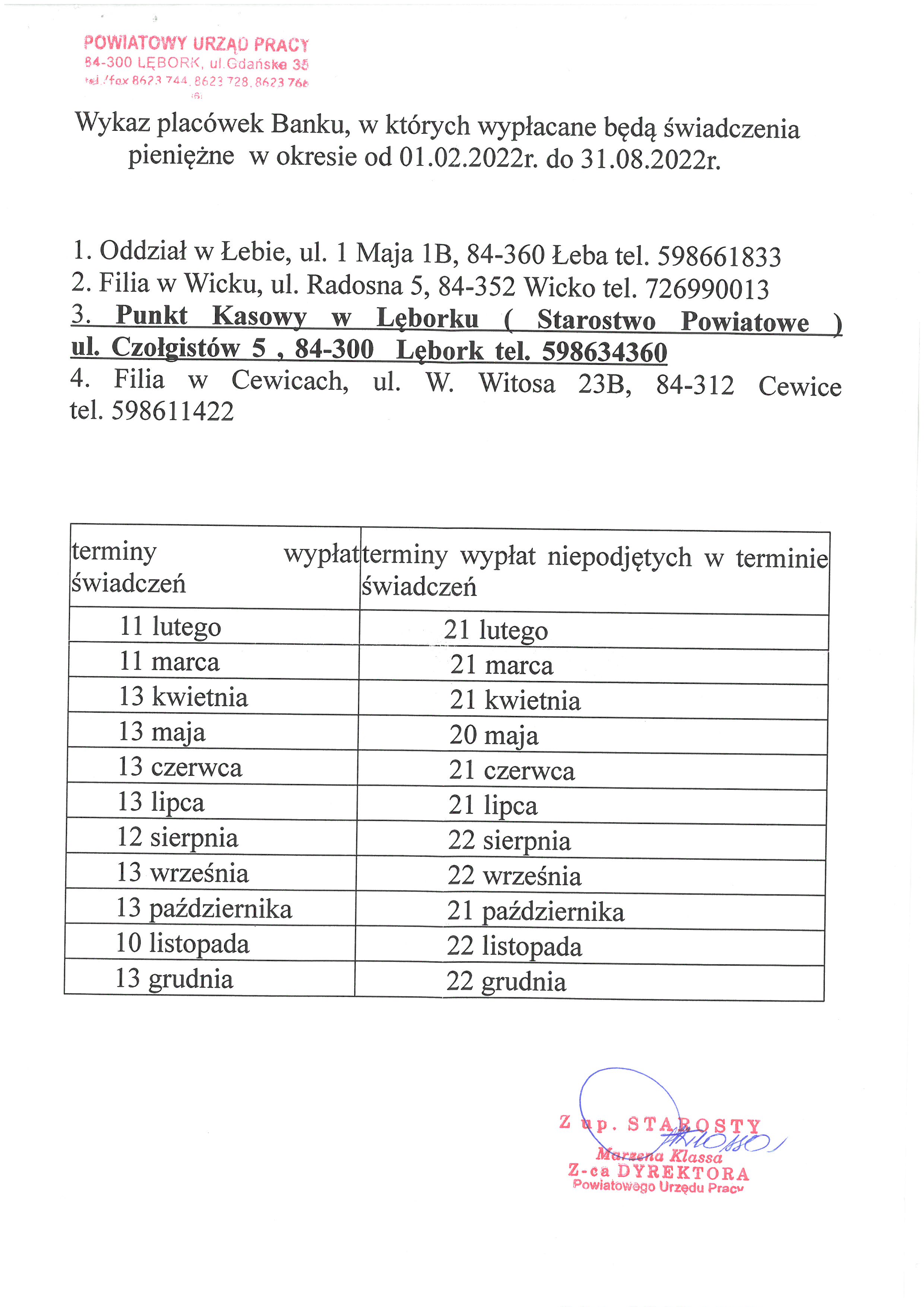 Powiatowy Urząd Pracy w Lęborku przekazał informację o harmonogramie wypłat świadczeń w 2022 roku za okres od dnia 01.02.2022 do dnia 31.08.2022 r. Świadczenia wypłacane będą w Punkcie Kasowym w Starostwie Powiatowym w Lęborku przy ul. Czołgistów 5, tel. 59 8634 360.