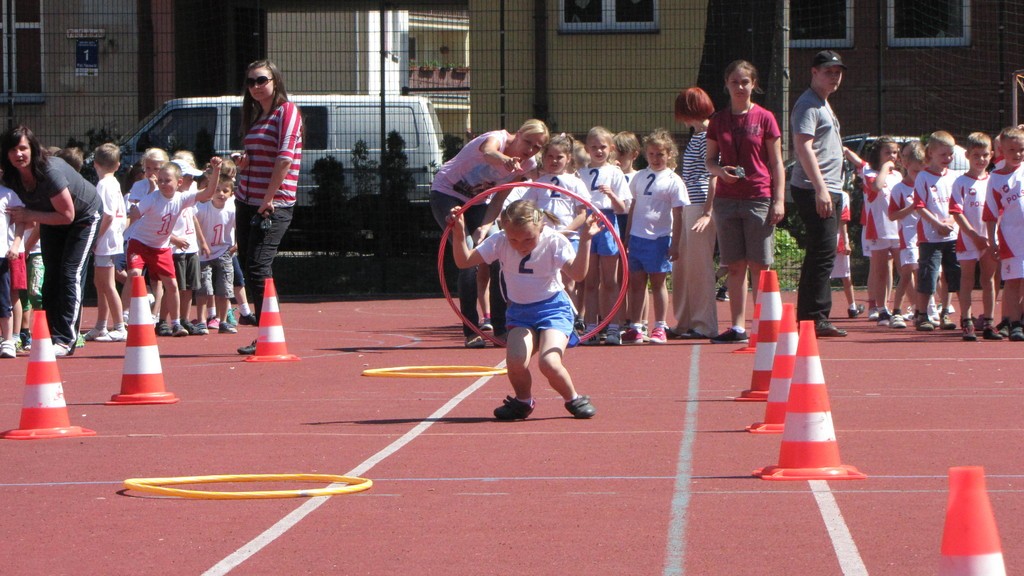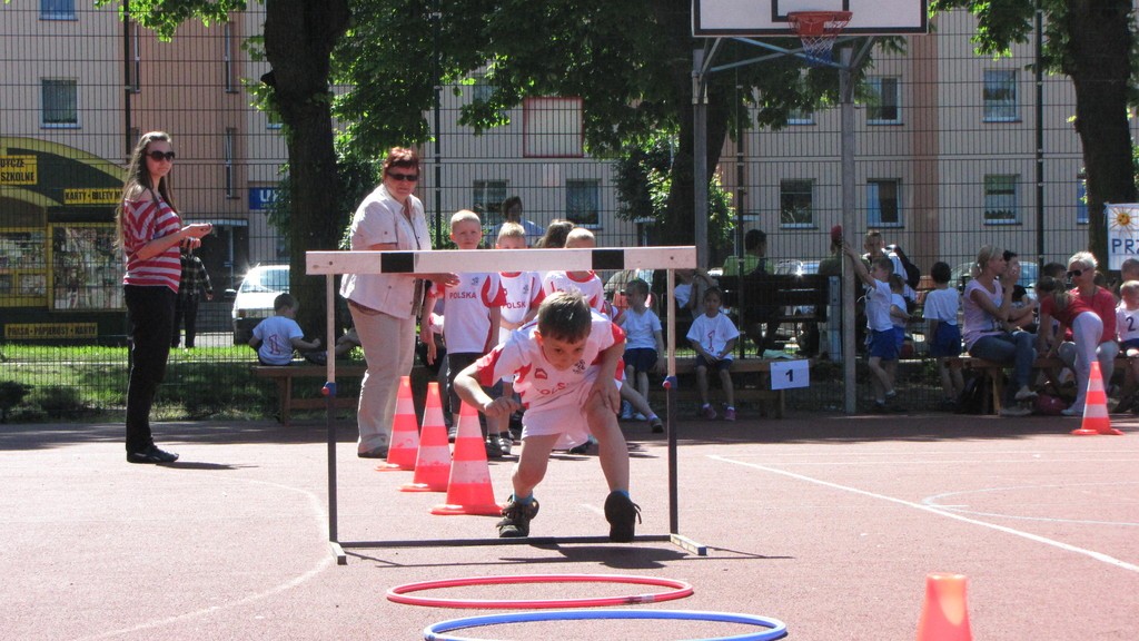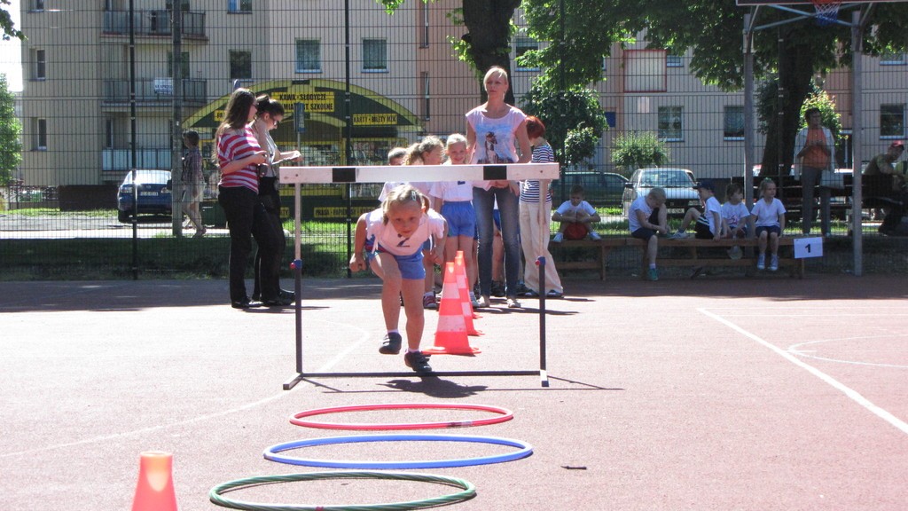 Drużyna każdego przedszkola składała się z 20- tu zawodników (10 dziewcząt i 10 chłopców). Dzieci wzięły udział w 5 zabawach sportowych: „Sadzenie ziemniaków”, „Tor przeszkód”, ,,Tworzenie figur geometrycznych”, „Celowanie do okienka” oraz „Bieg z przechodzeniem przez hula hop”.