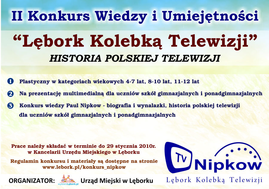 Rusza II edycja Konkursu Wiedzy i Umiejętności „Lębork Kolebką Telewizji". W 2010r. przypada 150-rocznica urodzin znanego lęborczanina i wynalazcy Paula Nipkowa. W I edycji konkursu na konkurs plastyczny wpłynęło 529 prac, na prezentację multimedialną - 34 prac, na projekt strony internetowej - 8. Finał konkursu 5 marca 2010r.