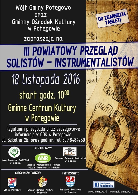 Wójt Gminy Potęgowo oraz Gminne Centrum Kultury w Potęgowie zapraszają za III Powiatowy Przegląd Solistów – Instrumentalistów w dniu 18 listopada 2016.