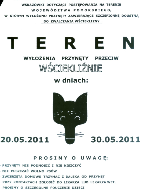 W zależności od warunków atmosferycznych w dniach od 23.05 do 30.05 2011r. będą prowadzone szczepienia ochronne przeciwko wściekliźnie dzikich zwierząt.