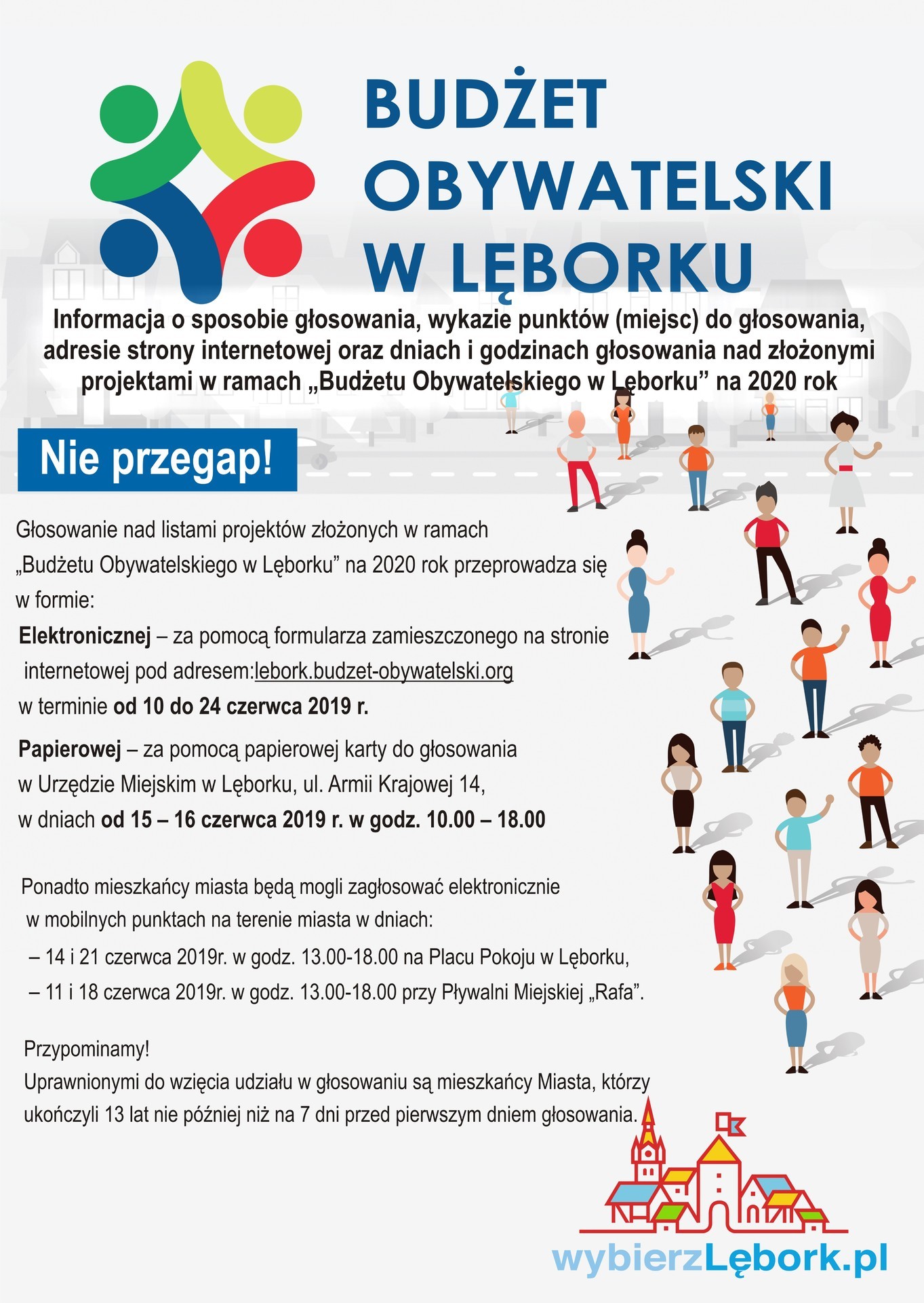 - Elektronicznej – za pomocą formularza zamieszczonego na stronie internetowej pod adresem: lebork.budzet-obywatelski.org w terminie od 10 do 24 czerwca 2019 r.