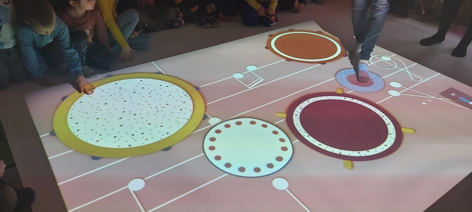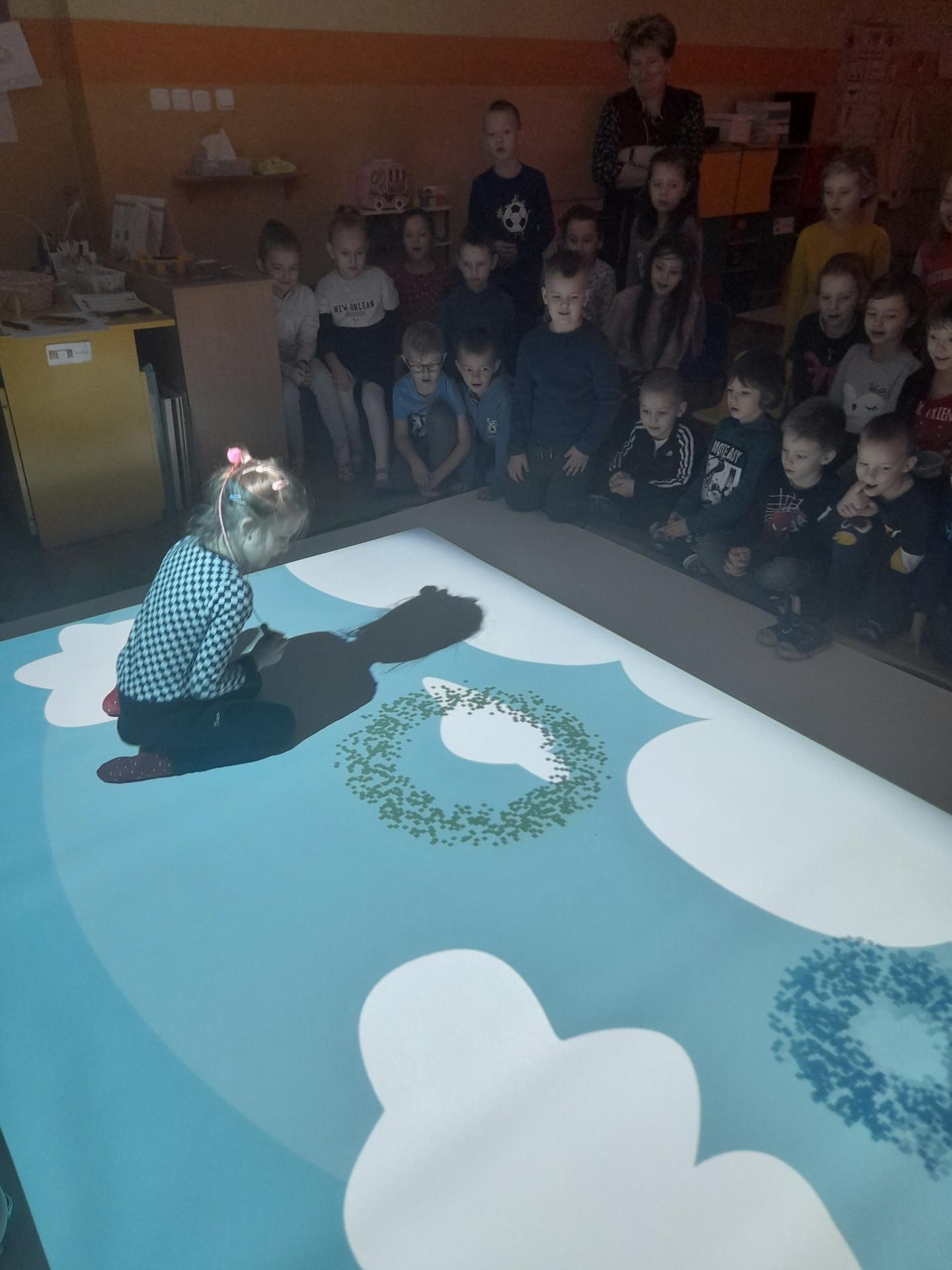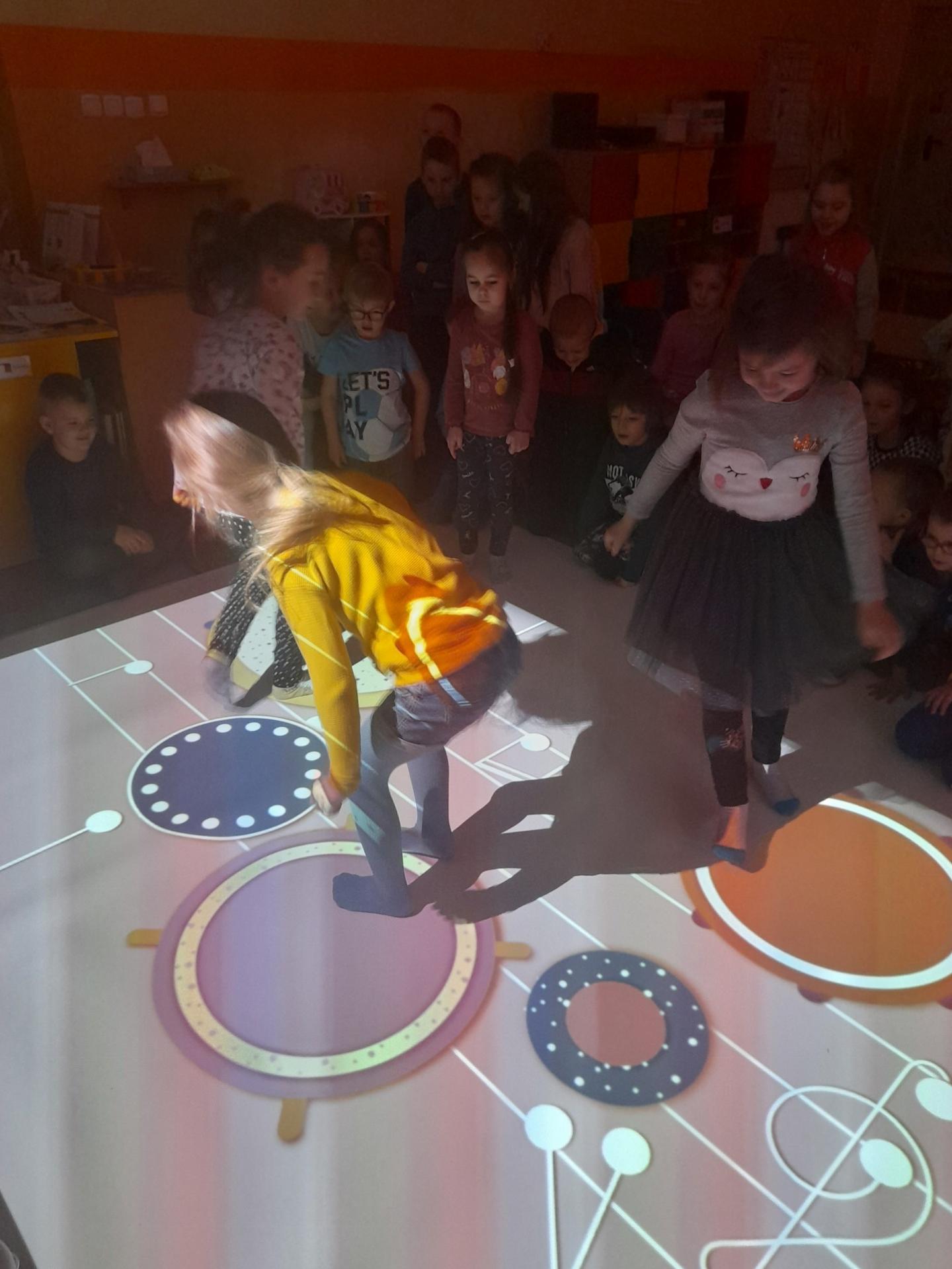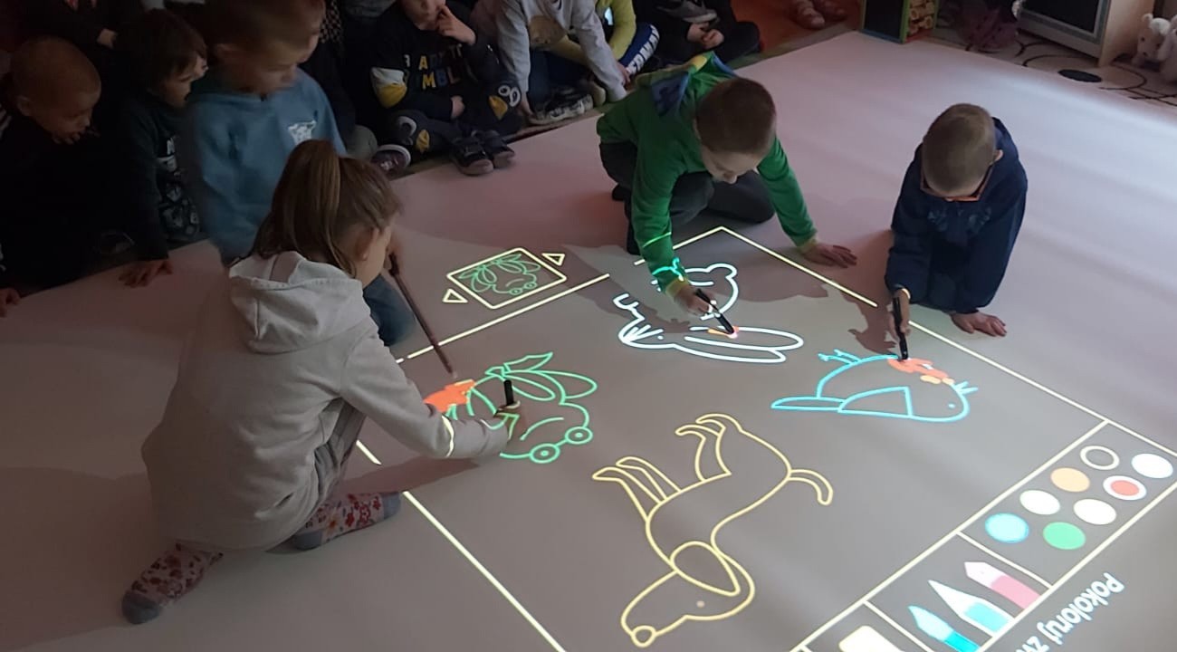 Na zdjęciach zabawy dzieci z Przedszkola nr 2 przy Emilii Plater na interaktywnej podłodze. Przedszkolaki wzięły udział w zabawach ruchowych na bieżni lub boisku, zabawach manualnych w kolorowanie, zabawach rozwijających spostrzegawczość (łapanie balonów lub złapanie kreta), zabawach muzycznych. Na odkrycie czeka jeszcze wiele aktywności z szerokiej bazy zabaw interaktywnej podłogi.