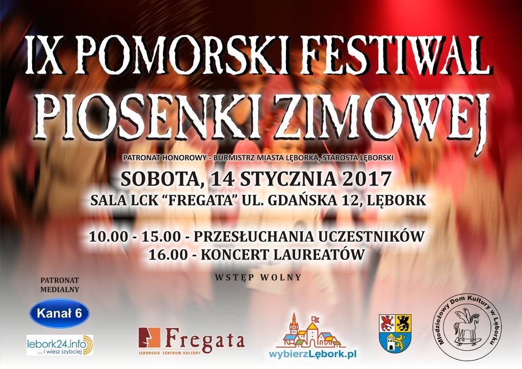 Młodzieżowy Dom Kultury w Lęborku i Lęborskie Centrum Kultury "Fregata" zapraszają na IX Pomorski Festiwal Piosenki Zimowej Lębork 2017. Impreza pod patronatem Burmistrza Miasta Lęborka i Starosty Powiatu Lęborskiego odbędzie się 14 stycznia 2017 r. w lęborskiej "Fregacie" przy ul. Gdańskiej 12-13.
