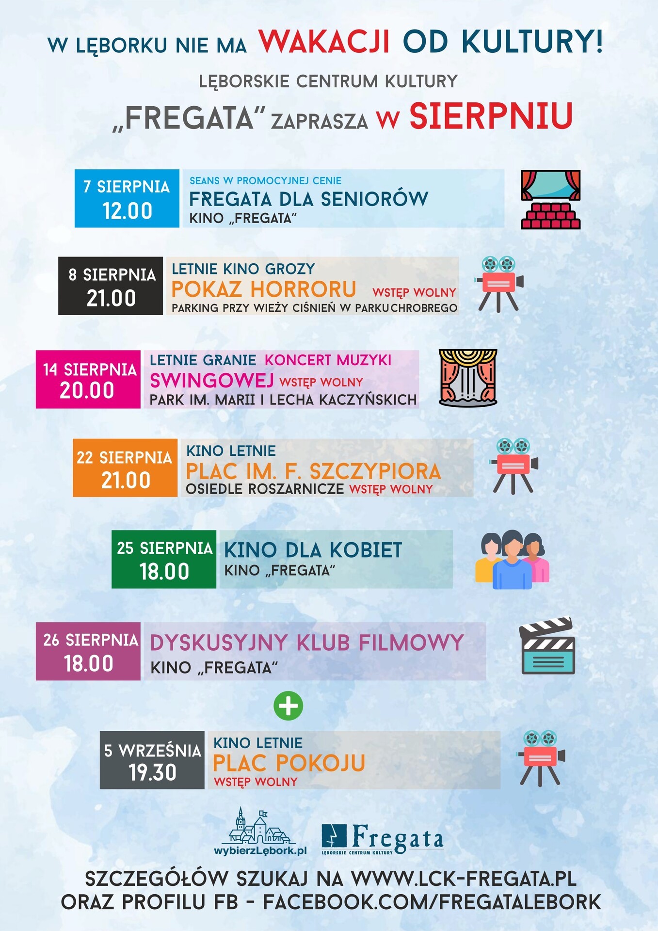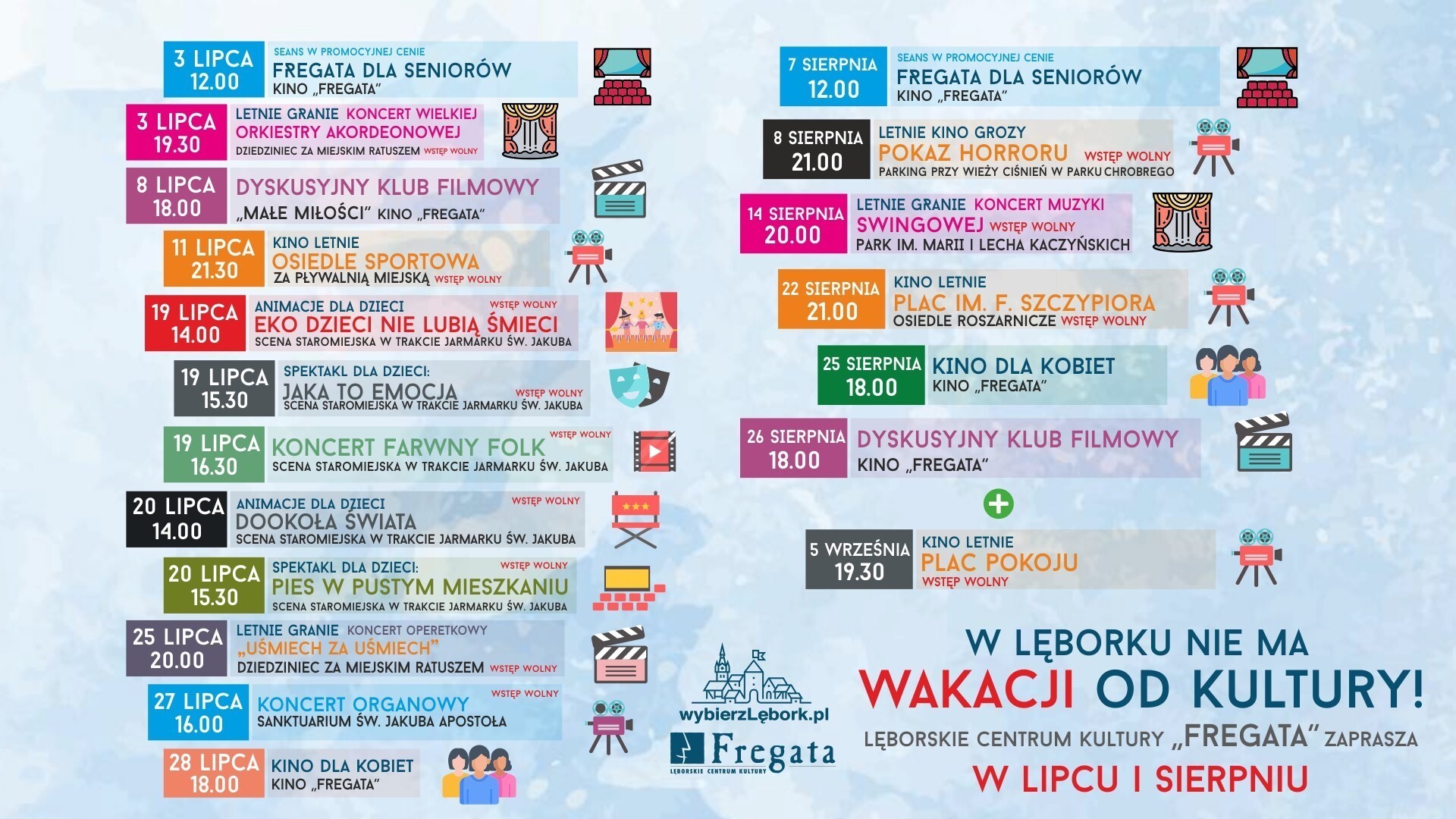 Lato 2025 zapowiada się w Lęborku wyjątkowo intensywnie! Lęborskie Centrum Kultury „Fregata” przygotowało moc atrakcji - koncerty, kino pod chmurką, spektakle, animacje i wiele więcej – dla dzieci, dorosłych i seniorów!