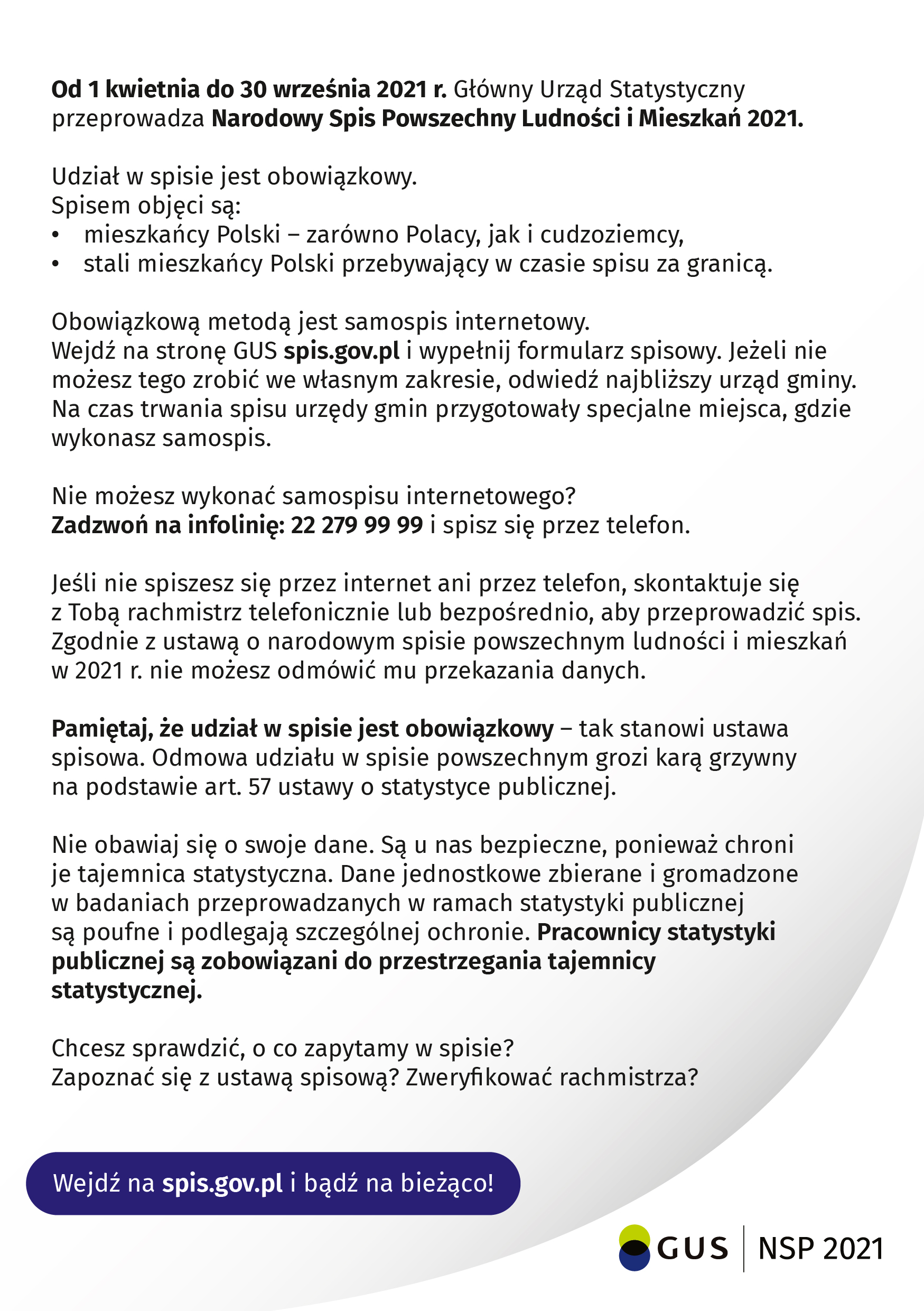 W związku z rozpoczęciem Narodowego Spisu Powszechnego Ludności i Mieszkań 2021 i jego wydłużeniem do 30 września br. uprzejmie informujemy, że podstawową metodą realizacji obowiązku spisowego jest samospis poprzez aplikację: kliknij tutaj