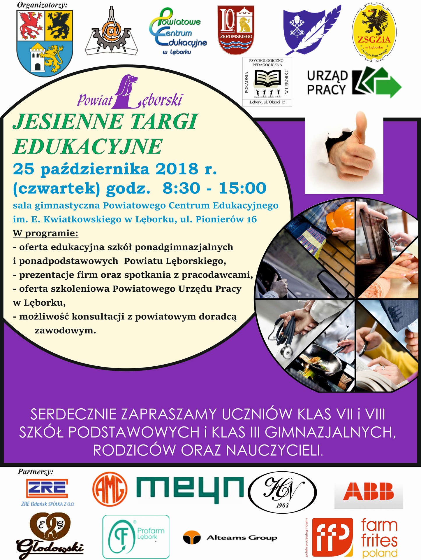 Jesienne Targi Edukacyjne odbędą się 25 października w godz. 8.30-15.00 w Sali gimnastycznej PCE przy ul. Pionierów 16. Organizatorzy serdecznie zapraszają uczniów, rodziców i nauczycieli.